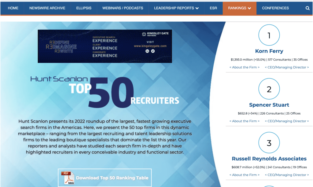 Hunt Scanlon conducts original research to compile its list of the leading search firms. Hunt Scanlon Media — the most widely referenced, single source for information in the human capital sector. It specializes in covering the retained executive search business. While many of the search firms listed in the Top 50 also advertise with Hunt Scanlon, others do not. So out of all the lists, the Hunt Scanlon list seems the most reliable.