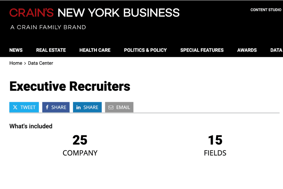 Crain’s New York Business has published a list of the 25 largest executive recruiters. It is available in Crain’s Book of Lists. Crain’s New York Business also sells the data for download.